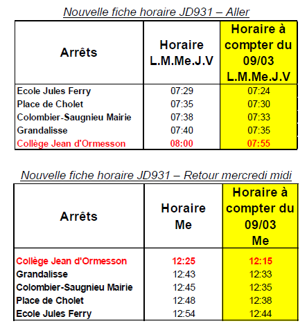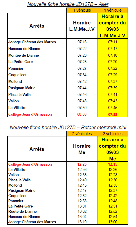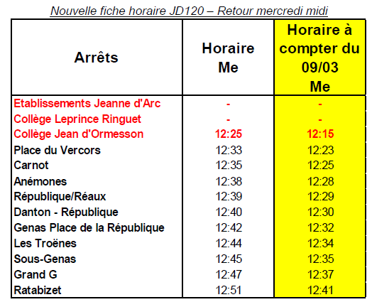 - Le départ du mercredi midi est avancé à 12h15 (au lieu de 12h25).